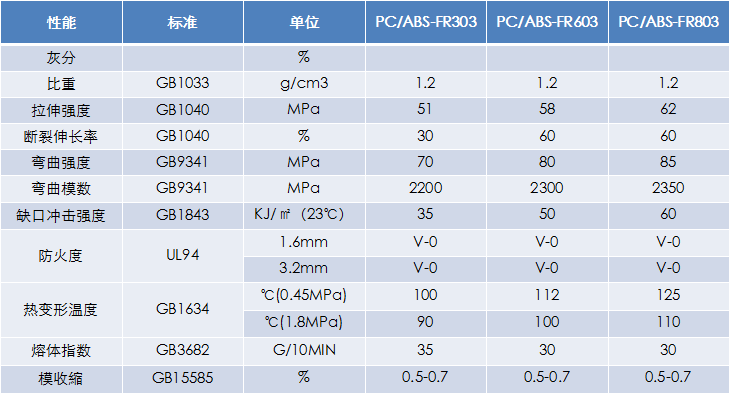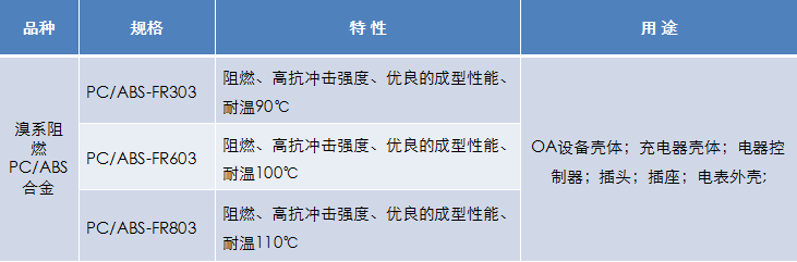 牌號:PC/ABS-FR303、PC/ABS-FR603 、PC/ABS-FR803
