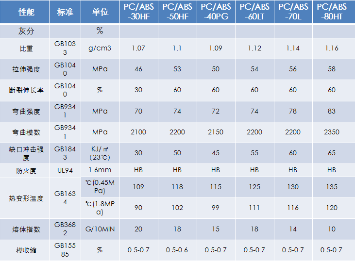 牌號(hào):PC/ABS-30HF、PC/ABS-50HF 、PC/ABS-40PG、 PC/ABS-60LT 、PC/ABS-70L、PC/ABS-80HT